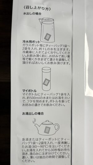 約1ℓの水に1〜2袋入れて冷蔵庫で冷やす